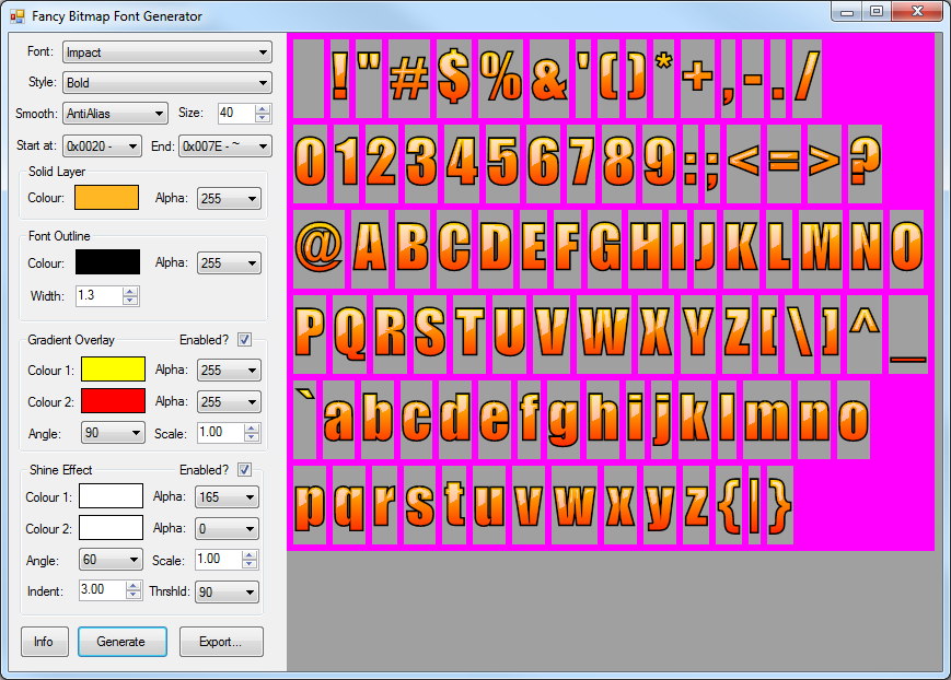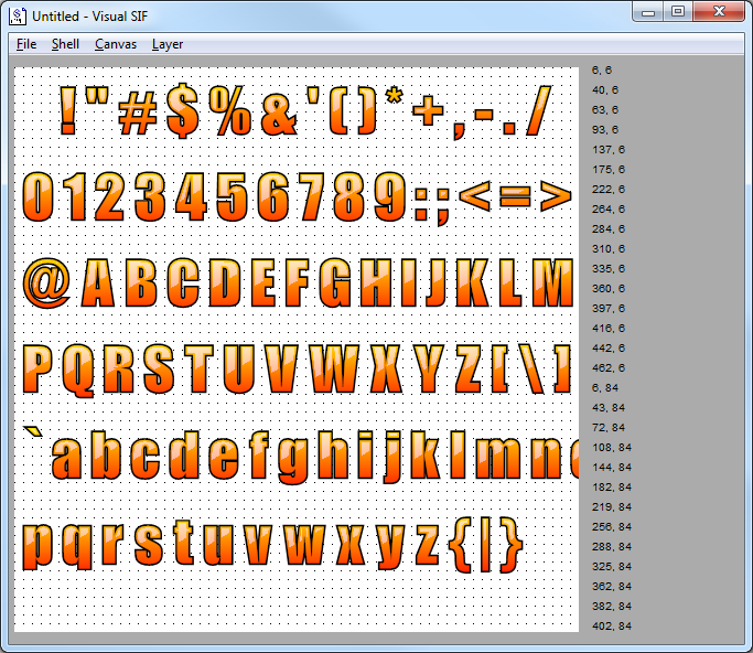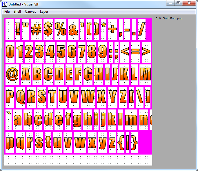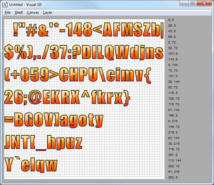 SIF FontsOne day I decided I needed a solution for drawing text into an OpenGL scene. I also needed fonts, and I happened across the Fancy Bitmap Font Generator. After generating a bitmap font, I updated my Visual SIF application to cut out the individual pieces of the font and arrange them in a space-efficient layout.